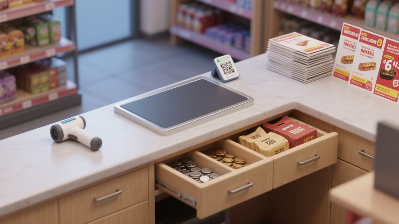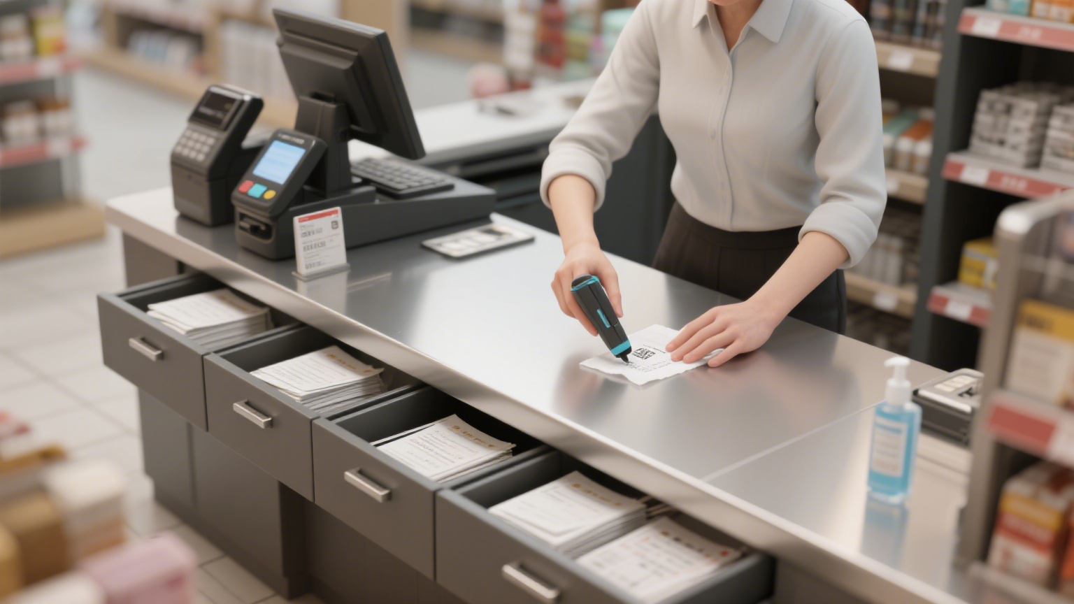 将收银台物品按 “高频使用(扫码枪、收据纸)、备用物品(零钱盒、包装袋)、展示物品(促销单页)” 分类;高频使用物品放在收银员伸手可及的位置,备用物品放入收银台抽屉并分区收纳,促销单页整齐堆叠在台面角落,避免遮挡操作空间。