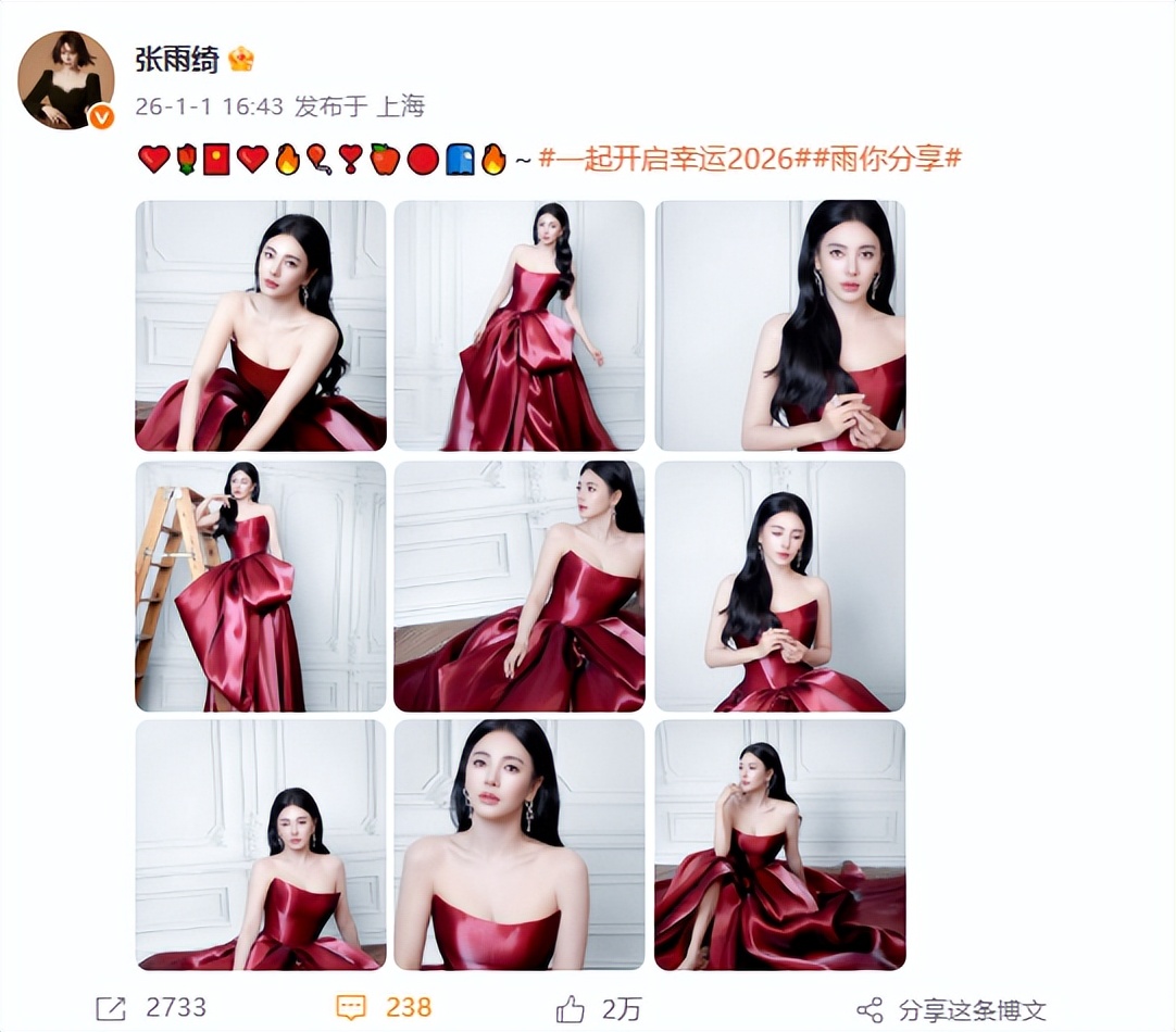 张雨绮从《长江七号》里柔美的袁老师起步,后来凭《美人鱼》里凌厉的李若兰、《乘风破浪的姐姐》里飒爽的舞台表现,把 “明艳大气” 揉成了独有的气质 —— 她偏爱能衬出气场的造型,妆造里的每一处细节,都和她 “直爽又精致” 的性格贴得紧。2026 年元旦,她在上海发布的这组酒红缎面礼服九宫格,刚好把她气质里的 “柔与飒”,都裹在了缎面的光泽里。