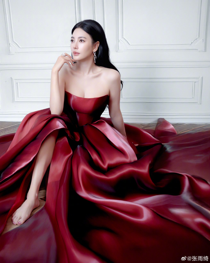 她坐在地面,酒红礼服的裙摆彻底铺开,缎面的褶皱在光里连成一片,像把整抹红铺成了背景。《美人鱼》里她演的李若兰总带着 “紧绷的锐利”,现在这坐地的姿态里,裙摆裹着她的腿,连肩颈的线条都松下来,是把角色里的锐利,换成了生活里的舒展气场。