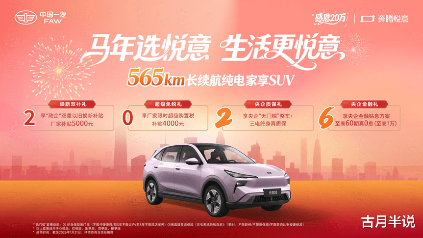 春节前车市向来热闹,今年又多了一位“高调玩家”。一汽奔腾在2025年凭借“悦意”新能源序列实现销量突破20万辆后,近日正式推出面向2026年的“悦意新年欢乐购”政策,以“焕新双补、超级免税、终身质保、长周期0息”四重举措,直接瞄准春节购车档期。