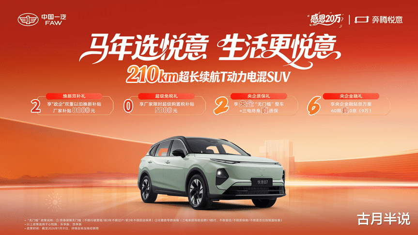 政策覆盖其两款主力新能源车型:纯电SUV悦意03与电混SUV悦意07。前者主打“8万级565公里续航”的经济性家用电车定位;后者则依托1.5T插混系统,强调210公里纯电续航与综合超1500公里的长途能力,试图在混动市场中以“长纯电续航”建立认知。