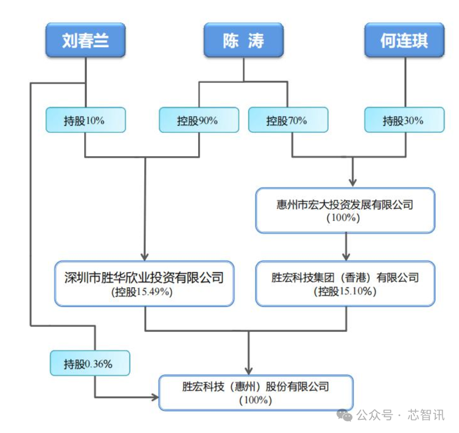 根据胜宏科技披露的信息,截至2025年12月31日,公司董事长陈涛通过直接和间接方式持有公司30.95%股权,为公司实际控制人。公司董事刘春兰女士持有3,151,642股,与陈涛通为夫妻关系。