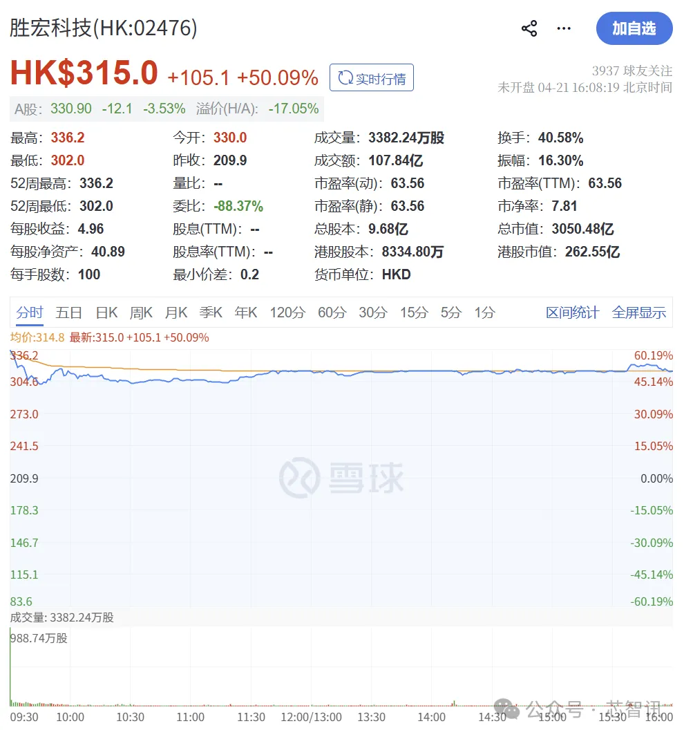 上市首日,胜宏科技股价表现惊艳,以315港元/股收盘,较发行价209.88港元大涨50.09%,盘中最高涨幅一度超过60%,总市值突破3000亿港元,达到约3598亿港元。