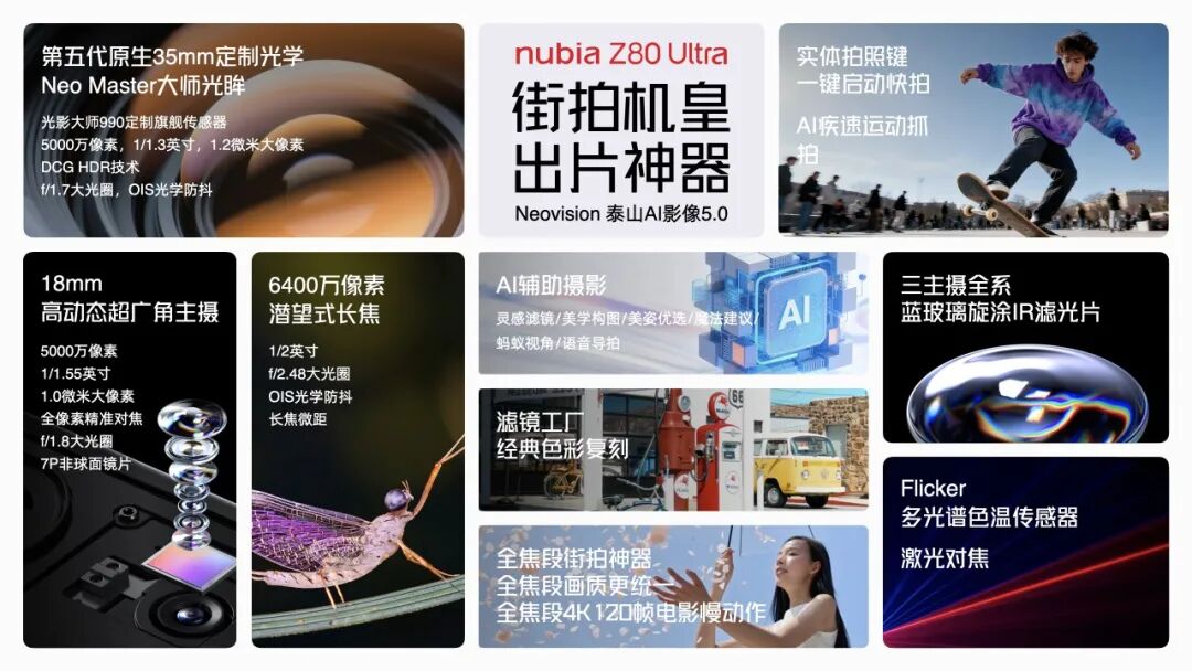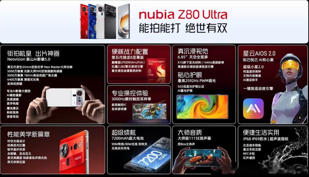 10月22日,“能拍能打,绝世有双”努比亚Z80 Ultra在影视飓风Storm Landing发布。新机以35mm+18mm独家定制街拍黄金双焦段、实体拍照键、AI影像大师,打造街拍机皇与出片神器;搭载年度最强第五代骁龙8至尊版、红魔同款CUBE擎天游戏引擎、业界独家天空全面屏与7200毫安时第四代南海电池,成就拥有王者性能的游戏操控利器;星云AIOS 2全面进化,让AI更全面,体验更流畅。