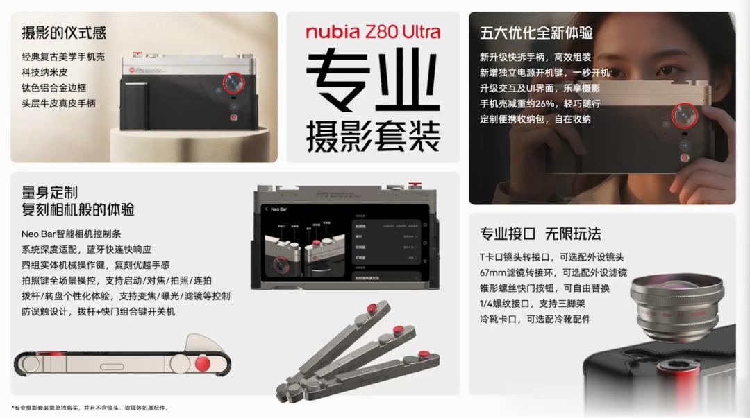 除了光学、AI与街拍场景深度匹配,努比亚Z80 Ultra还带来一款“炸街装备”——专业摄影套装。其材质选用科技纳米皮、钛色铝合金边框与头层牛皮真皮手柄,质感温润细腻;量身定制的智能相机控制条、实体机械操作键,以及可自定义变焦/曝光/滤镜等参数调节的拨杆和转盘。套装支持独立电源开关键,快速启动;单体相比上代减重约26%,长时间拍摄也不会累手;支持T卡口扩展镜头转接口、冷靴接口,极大提高手机扩展能力。
