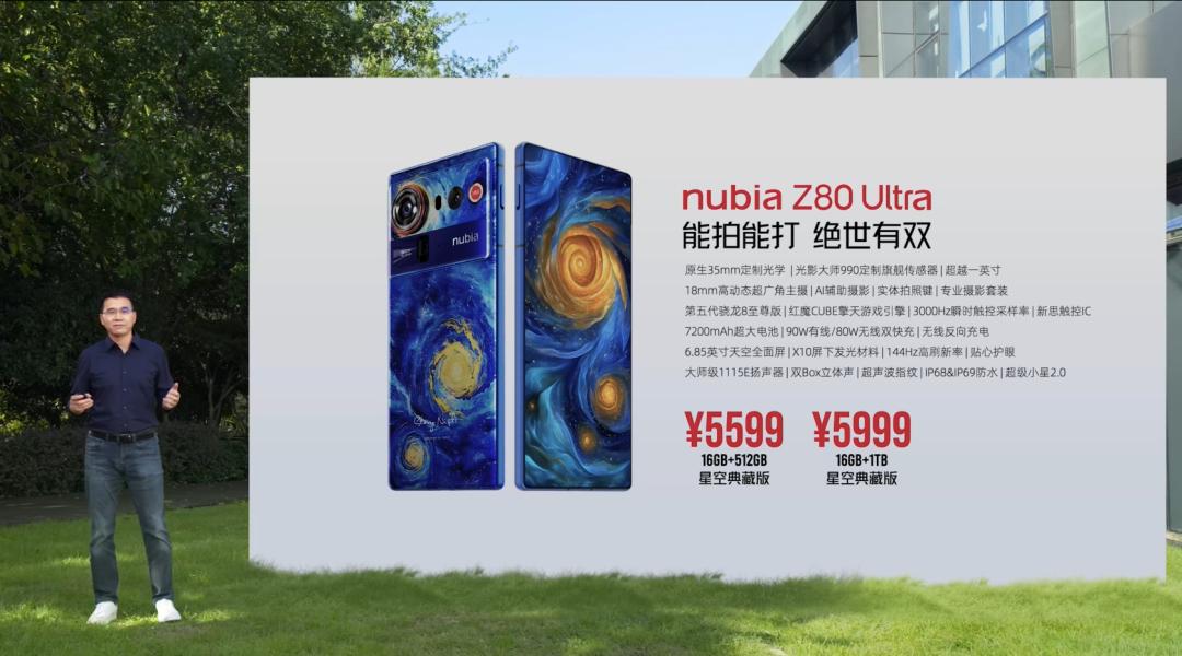 即日起,努比亚Z80 Ultra在中兴商城、京东、天猫、抖音、拼多多等各大渠道正式开售,12GB+512GB版售价4999元,16GB+512GB版售价5299元,16GB+1TB版售价5699元;努比亚Z80 Ultra星空典藏版16GB+512GB版售价5599元,16GB+1TB版售价5999元;努比亚Z80 Ultra洛天依限定版16GB+512GB版售价5799元。