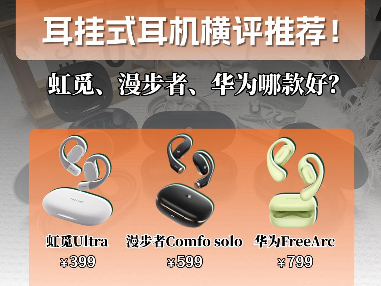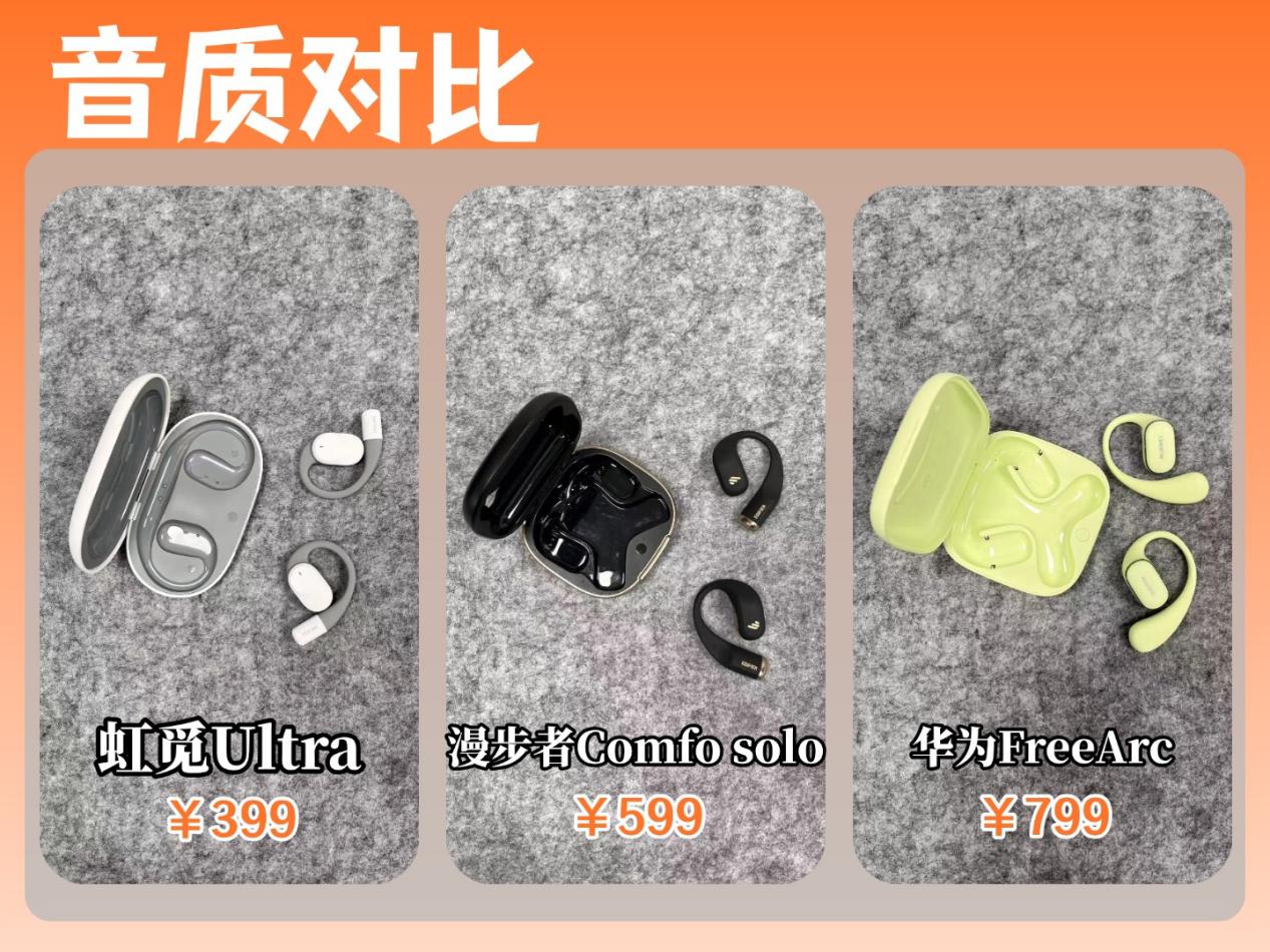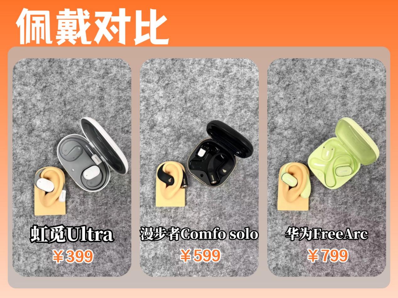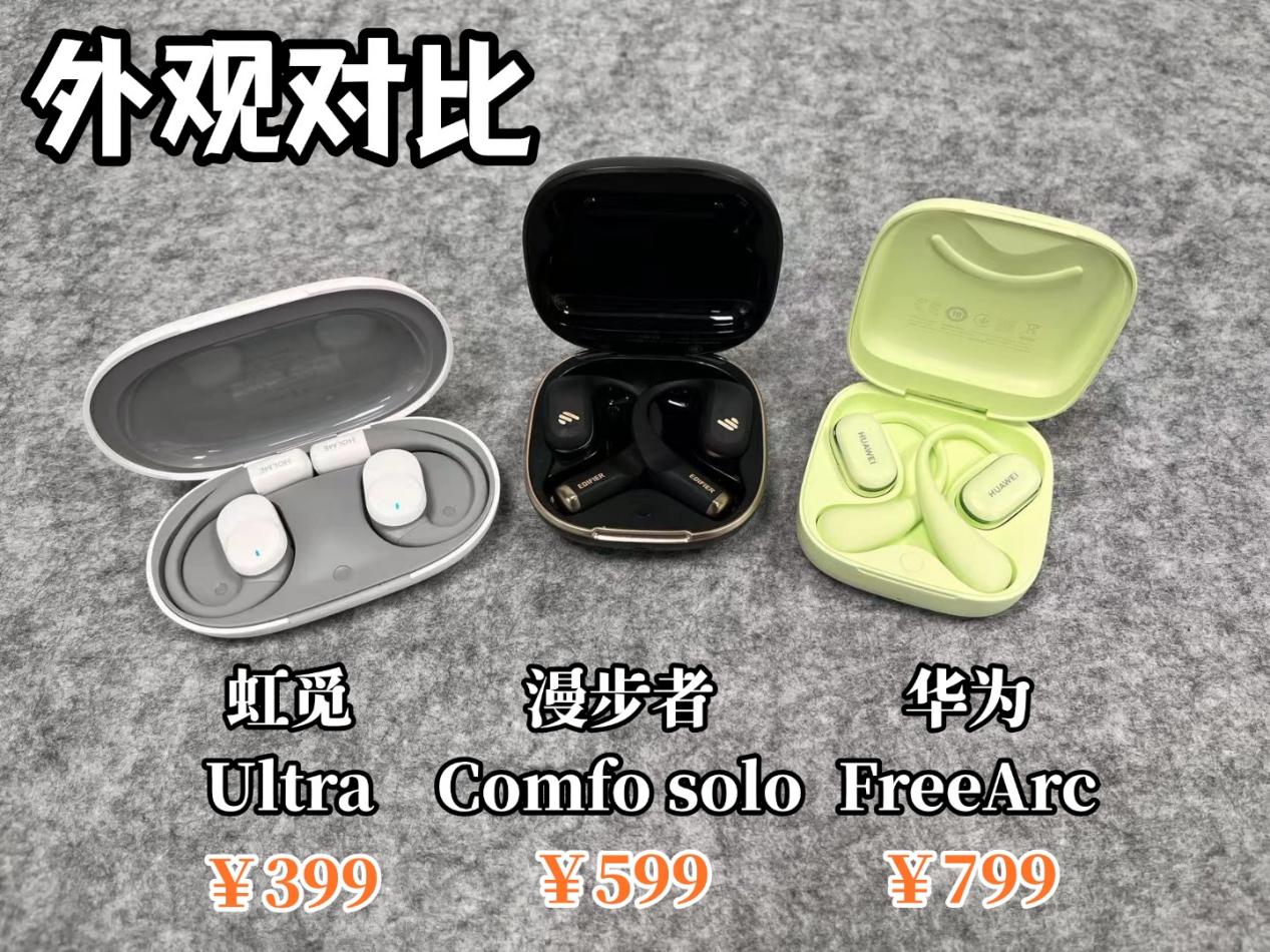 最近开放式耳机真的太火了,街上随处可见,但价格从几百到上千,挑起来真的头大!同样是开放式,为啥差价这么大?到底买哪款不翻车?我自己实打实测了十几款,最后留下3 款最能打、性价比在线的,今天用大白话给你们唠明白,分别是 399 元虹觅 Ultra、599 元漫步者 Comfo solo、799 元华为 FreeArc,从音质、颜值、佩戴、防漏音、续航全方面对比,纠结星人直接抄作业!