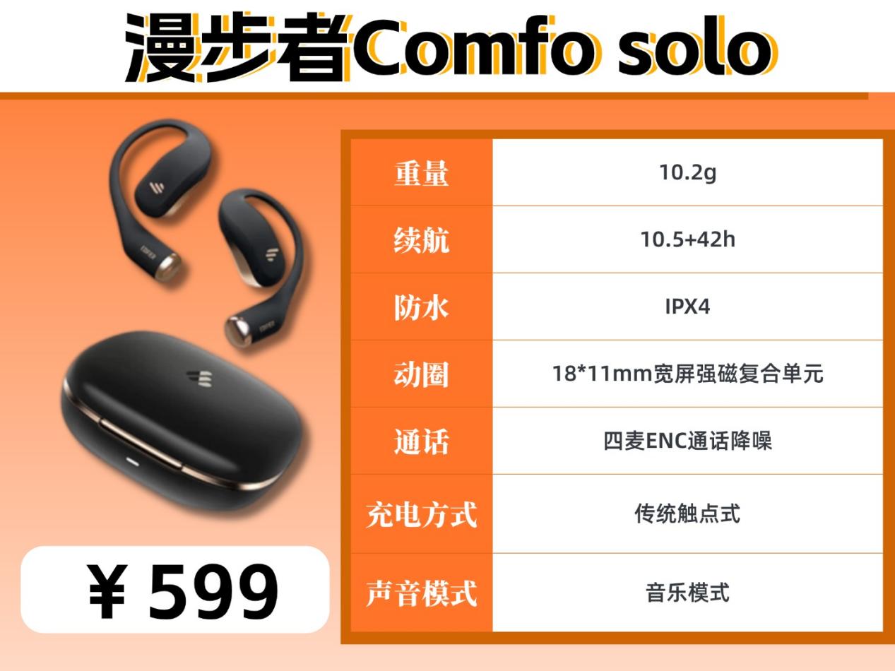 漫步者 Comfo solo:18*11mm 宽屏单元,支持 LDAC 高清传输,还有 360° 环绕声场,沉浸式听感拉满,音质很能打。