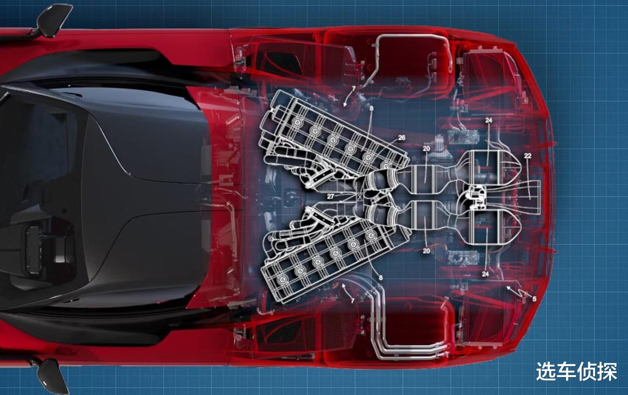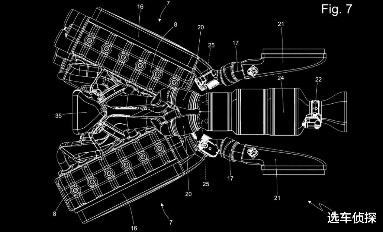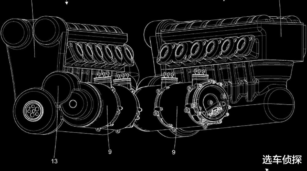在这项专利中,俯视图好像是一个V12发动机,其实是两台直列六缸发动机,从车顶俯视呈现出20°到30°的V形夹角。这种布局让整个动力单元更加扁平,可以保持法拉利标志性的中置比例,前后配重更像中置燃油车。