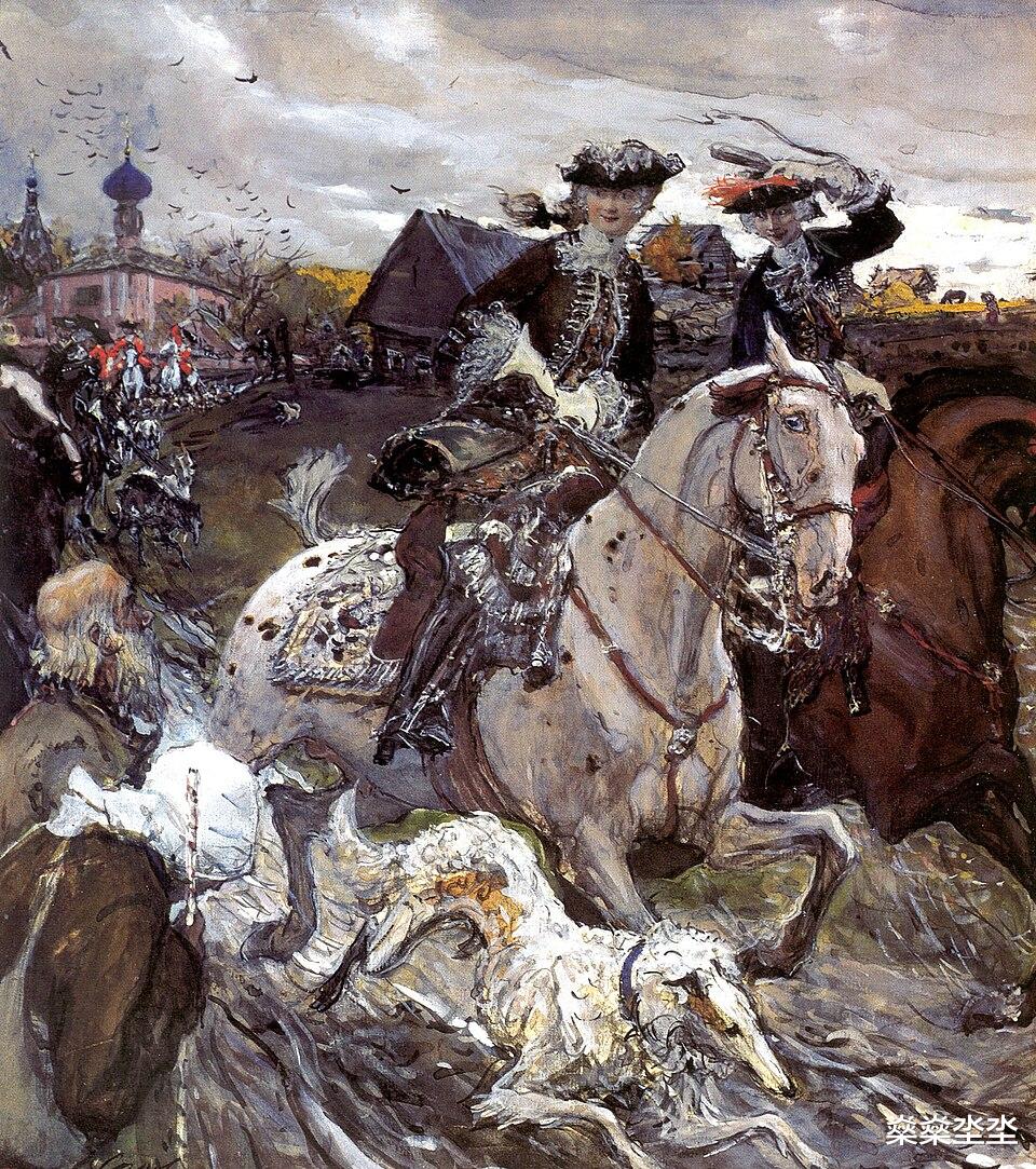 《彼得二世和伊丽莎白·彼得罗夫娜去狩猎》,V. Serov 的画作