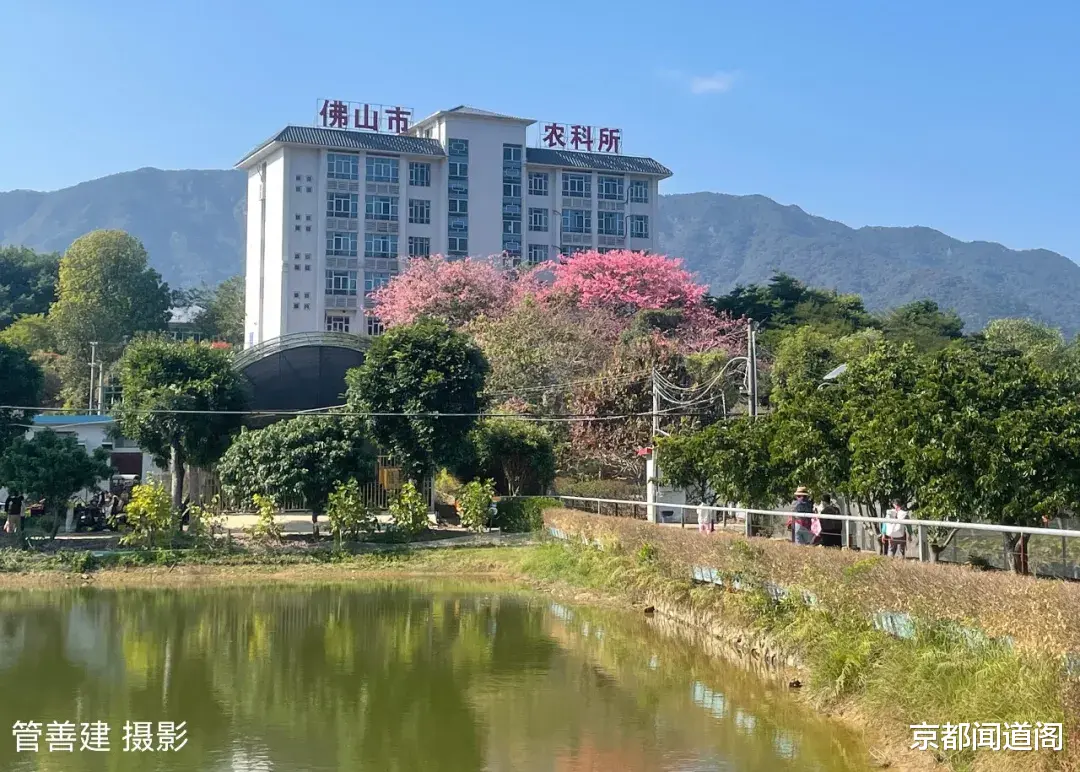 佛山市农科所位于佛山市三水区南山镇,在山脚不远处,一幢盖有碧色琉璃瓦的特色建筑掩映在繁花绿树中,赫然入目。门前紫花风铃木正值花期,花团锦簇,似乎为这网红科普打卡点的核心所在地着上了节日的盛装。