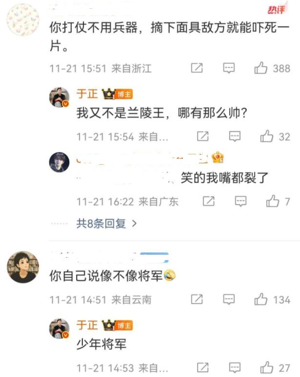紧接着,越来越多的网友来于正的评论区留言,我们可以看到:你打仗不用兵器,摘下面具敌方就能吓死一片,于正回复:我又不是兰陵王,哪有那么帅?还有网友说:你自己说像不像将军,于正表示:少年将军。