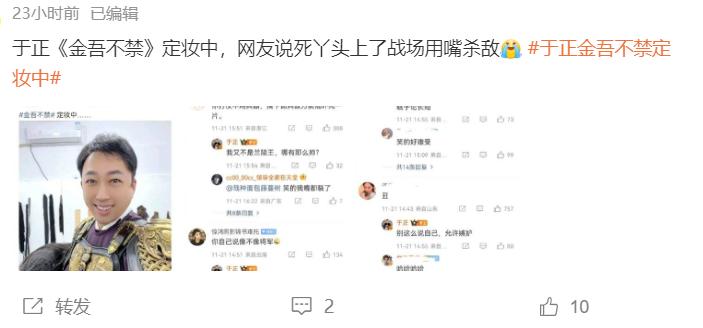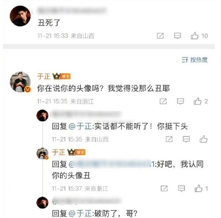 当于正发出自己的“将军”定妆照,表示:“定妆中”,然后网友们发现陈哲远的粉丝评论:“丑死了”,让大家没想到的是,于正竟回复这位网友:“你在说的你的头像吗?我觉得没那么丑耶”,而这位网友也非常刚,直接回复:“实话都不能听了,你挺下头”。