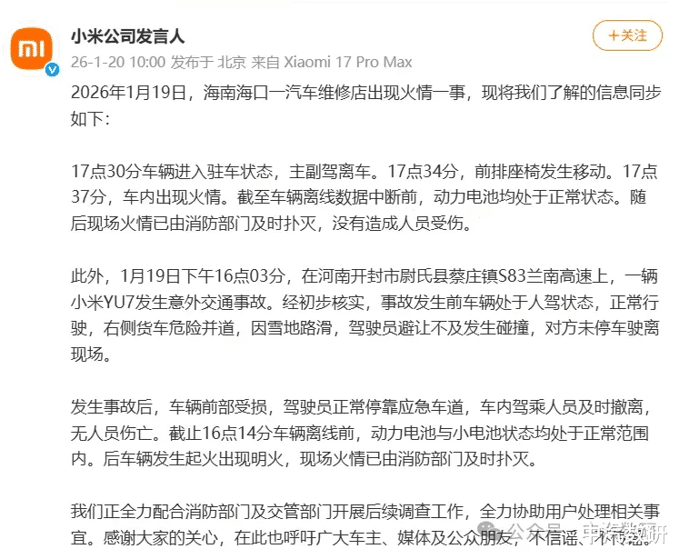 2026年1月19日,小米汽车在海南海口与河南开封接连发生两起独立安全相关事件。1月20日小米公司发言人发布官方通报,确认两起事件均无人员伤亡,企业正全力配合相关部门调查,后续将以调查结果为依据回应公众关切。这两起事件不仅引发市场对具体事故原因的关注,也让新能源汽车全场景安全防护问题再次成为行业讨论焦点。