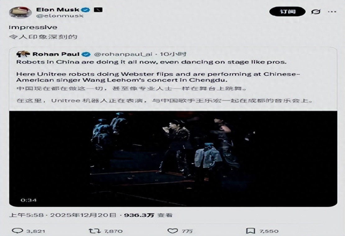 这一动态,竟让埃隆·马斯克都坐不住了。12月20日,他亲自转发评论Impressive,这一键之力,引发海外关注量超4000万,外国网友惊呼:中国科技太超前。