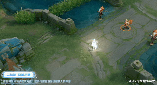 二技能范围变成一个印有大耳朵图案的甜品餐盘,四周浮现彩虹、云朵和勺子,释放甜品泡泡攻击敌人。