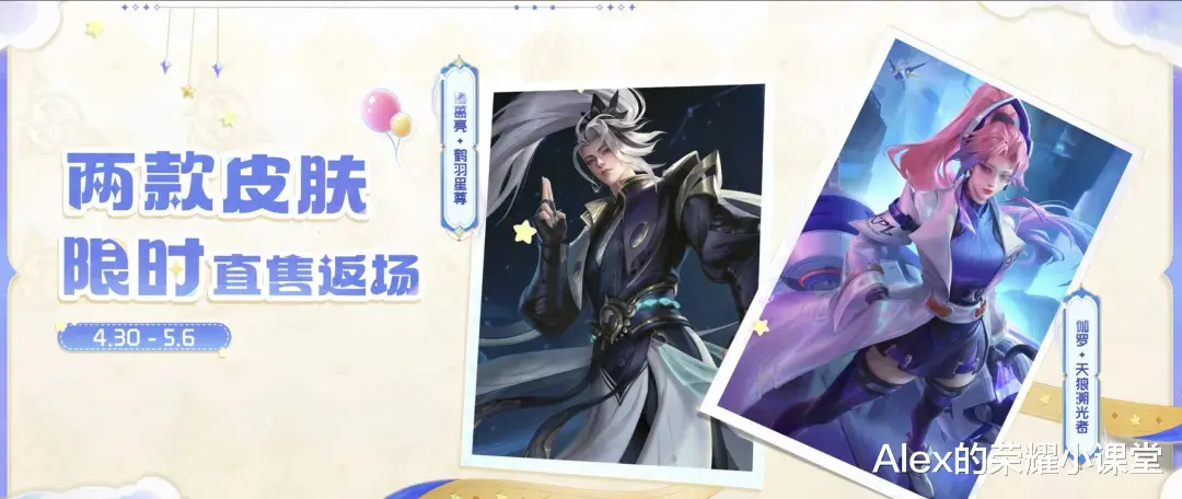 活动时间4月30日-5月6日,诸葛亮-鹤羽星尊返场、售价1788点券,伽罗-天狼溯光者返场、售价888点券。
