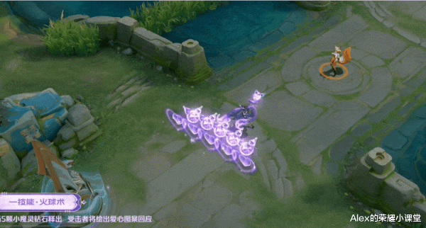 安琪拉释出5颗小魔灵钻石,命中敌人后有钻石碎裂的特效,被动印记为库洛米元素的香水瓶。