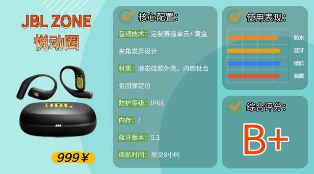 总结:JBL ZONE悦动圈延续品牌动感低频调校,核心优势聚焦动感音质与稳固佩戴,兼顾性价比与使用体验,是追求强劲节奏的运动爱好者的优质选择。