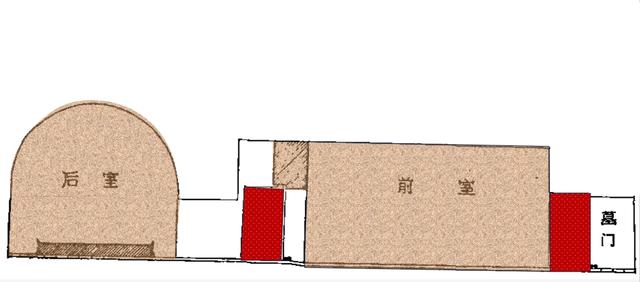 前室面积40多平方米,高4米。后室较前室宽敞些,前后室之间有甬道相连,前室和甬道之间设置了第二道门。这道门的形制与墓门形制一致。后室也是用砖砌成,穹顶,中间有用砖砌的须弥座作为棺床。