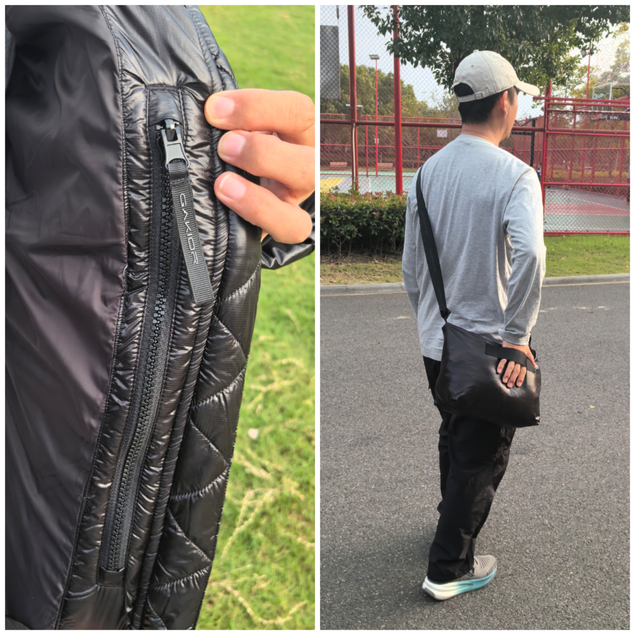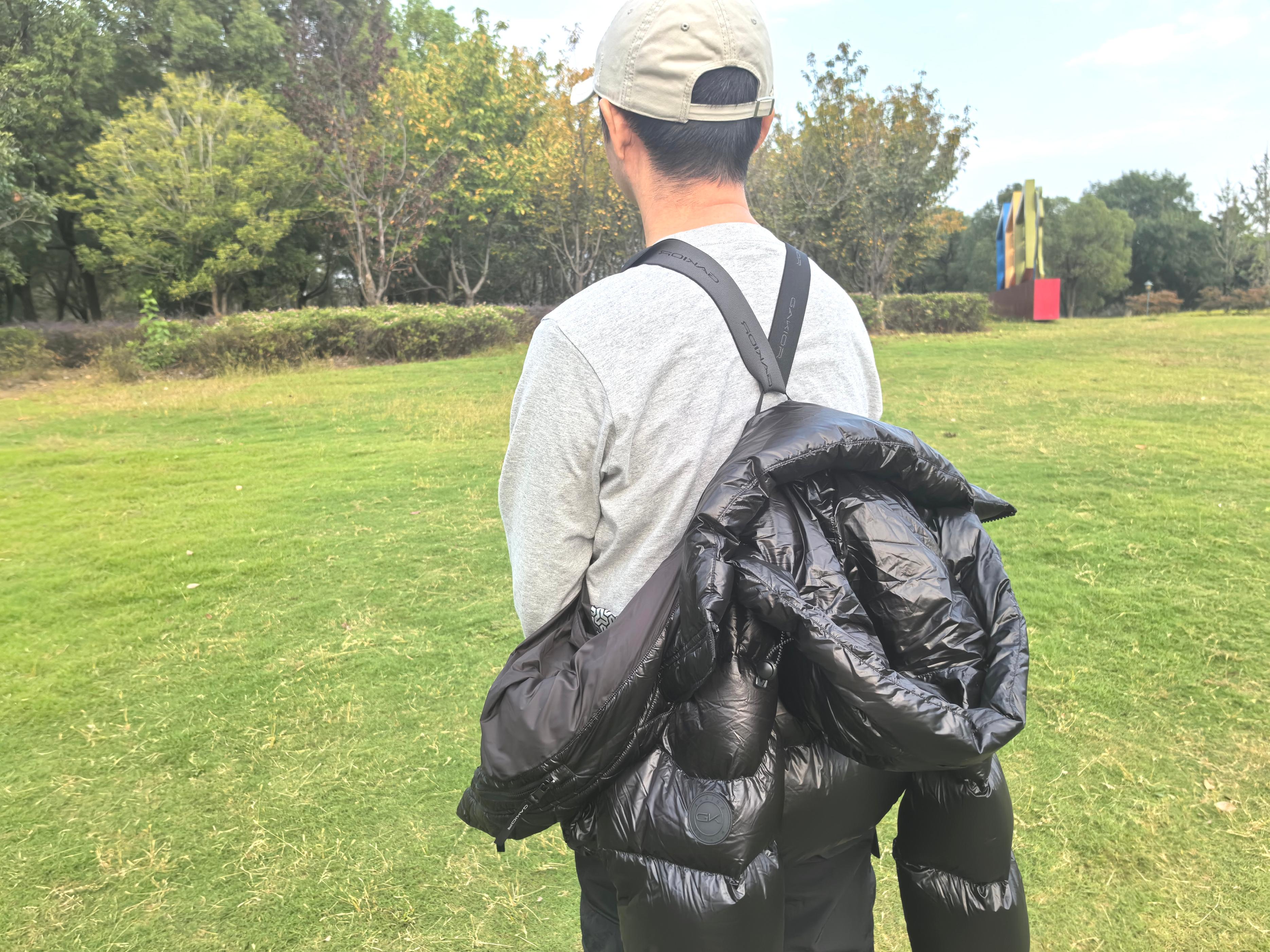 昼夜温差大,如果出去玩儿刚好太热了,临时不想穿,衣服里面有隐形背带,可以直接背在身上,想穿想背随意切换。而这一个背带,也是上一张图斜挎收纳时的背带。
