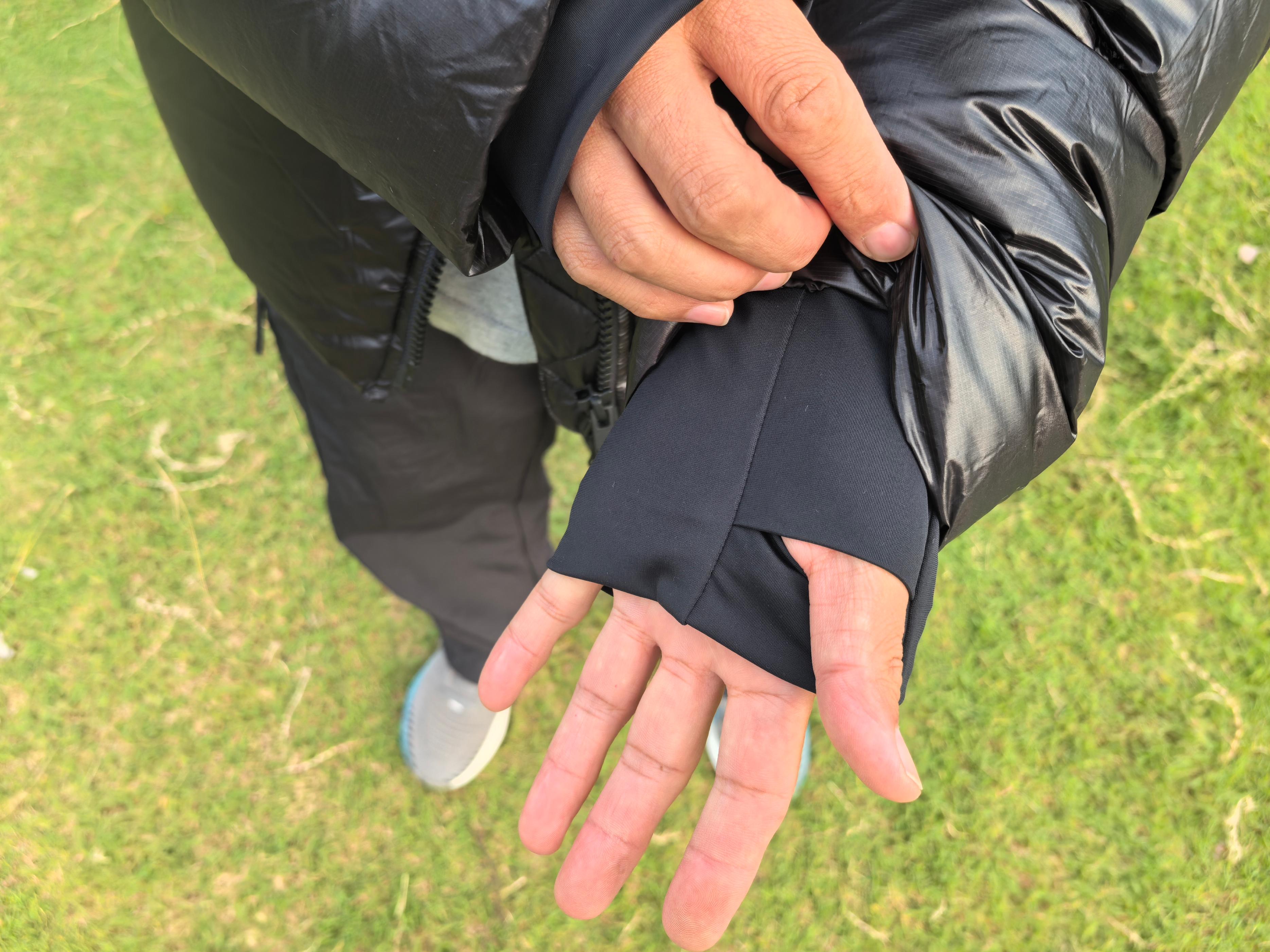 除了大面的防风,还需要配合各处防风细节设计,才能达到更好的防风保温效果。很多衣服的袖口,是特别容易钻风的地方。所以一些冬天的衣服,会在袖口的地方设置弹力防风袖口。而这一款在弹力防风袖口的地方,增加了拇指洞,我就特别喜欢这样的设计。穿起来感觉更服帖,防风效果更好,尤其是戴手套的时候,不容易把袖口推进去。