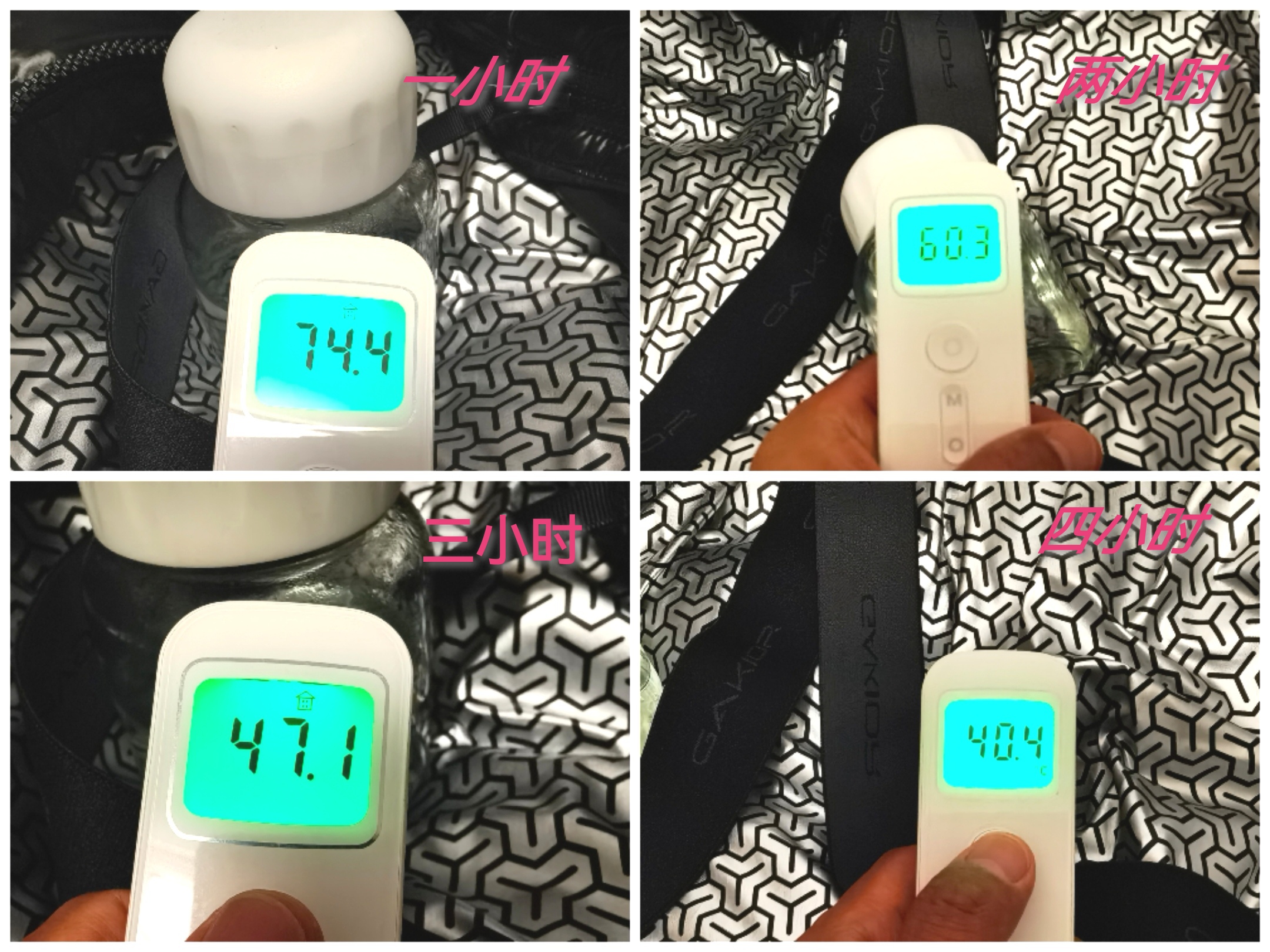 Gakior采用高品质白鹅绒 90% 高充绒量,选用进口防风面料与石墨烯加厚内衬,里面还有蜂窝式锁温膜和红外升温技术(就是拍照时里边的金色部分),由内到外高达六层锁温设计,其实都是围绕保温这一关键指标来做的努力。羽绒服防水、防风等等说了这么多材质和设计,那么这一件羽绒服的保温性究竟怎么样呢?如上图,由于羽绒服一开始是凉的,90度的水包到羽绒服里,一个小时后打开是74.4℃,降温幅度是最大的一个阶段,以后的温度都是每个小时打开一次测量的,随着温差的减少,温度变化越来越小,这效果堪比保温杯。