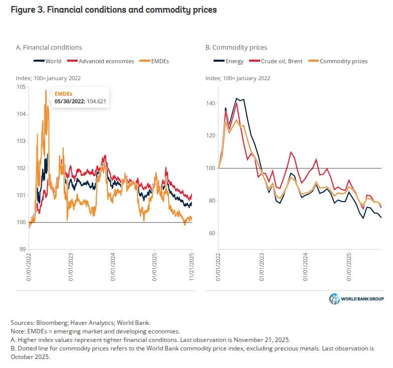 金融和大宗商品市场的发展也支撑了预期的转变。自春季以来,受强劲的风险偏好、活跃的股市以及美国更为宽松的货币政策(图3A)的推动,金融环境显著宽松。美元走软和长期收益率下降改善了新兴市场和发展中经济体(EMDEs)的融资渠道,促进了外币债券发行的复苏,并有助于收窄利差。