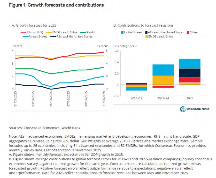 2025年,美国经济增长预期在主要经济体中波动最大,预测值从1月份的2.2%降至5月份的1.2%,随后在11月份回升至2.0%。此次反弹反映了强劲的人工智能相关投资、较低的利率、持续的财政支持以及适度的关税转嫁。但这种韧性远不止于美国。在其他发达经济体,预期增长已回升至1.4%,高于5月份的1.0%,接近1月份的水平。欧元区受益于通胀放缓、利率下降以及有针对性的财政措施。