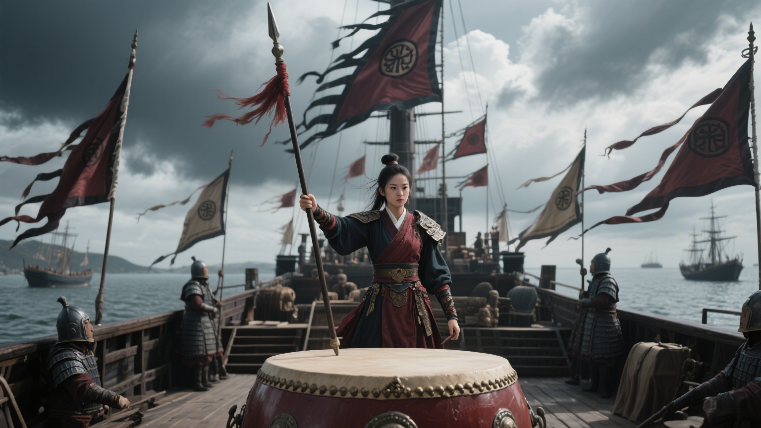咚!咚!咚!鼓声震天,响彻江面。每一记鼓点,都像是敲在士兵心头的战歌。她不是在打鼓,是在点燃将士们的血性!