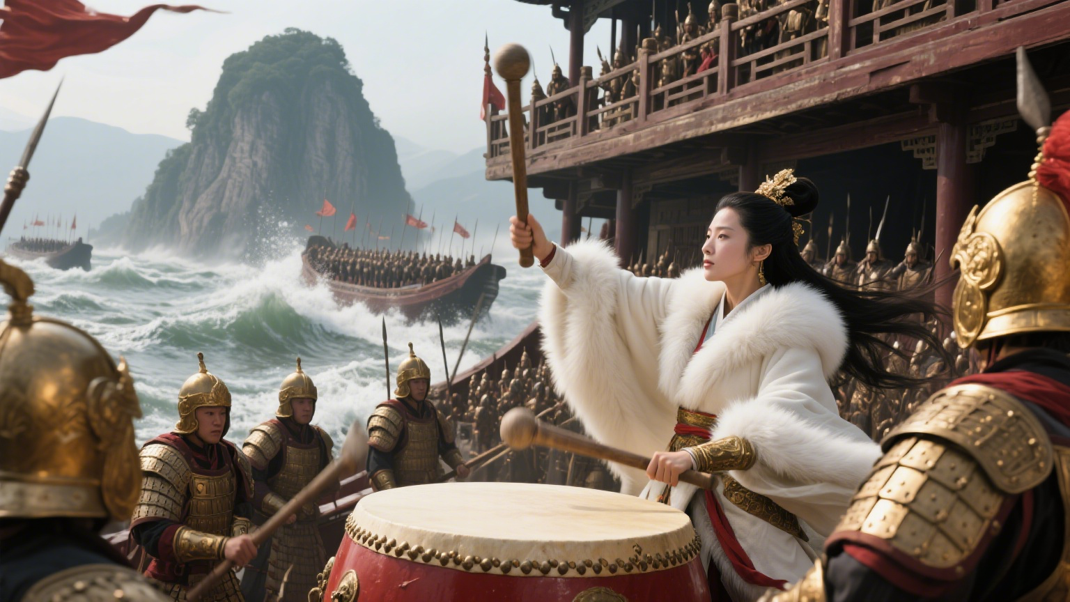 关键时刻,梁红玉身披铠甲,登上指挥舰楼,亲手执槌擂鼓!