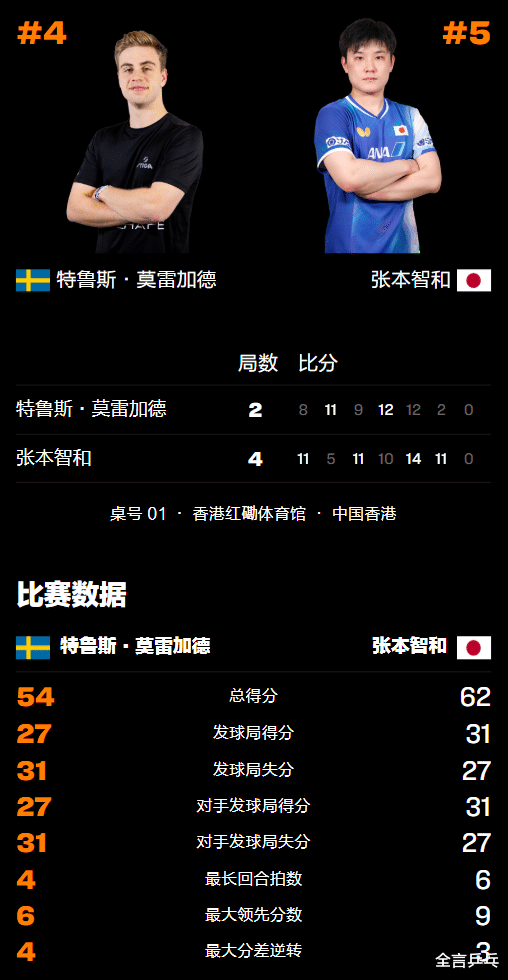 比赛开始后,莫雷加德在首局进入状态较慢,很快便1-4落后于人,中间段利用自己的正手进攻突破对方直线反超比分,但随后在反手位连续失误7-9、8-10陷入被动,随后再丢1分以8-11落败,张本智和在场上吼叫连连状态非常不错。