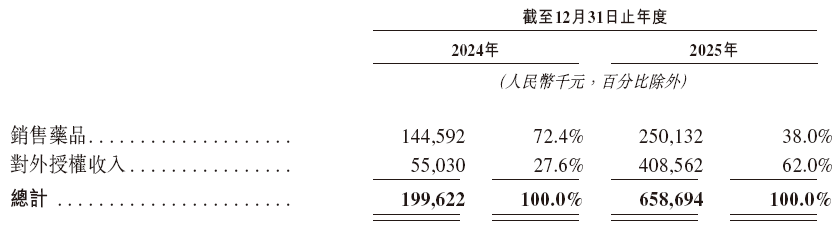 BD合作的密集落地与产品商业化的稳步推进,直接反映在了迈威生物2025年的财务数据上。2025年年报显示,迈威生物全年实现营业总收入6.63亿元,同比大幅增长231.62%;归母净利润为-9.69亿元,亏损较上年有所收窄,经营状况呈现向好态势。从收入构成来看,主要来自药品销售、对外授权收入。