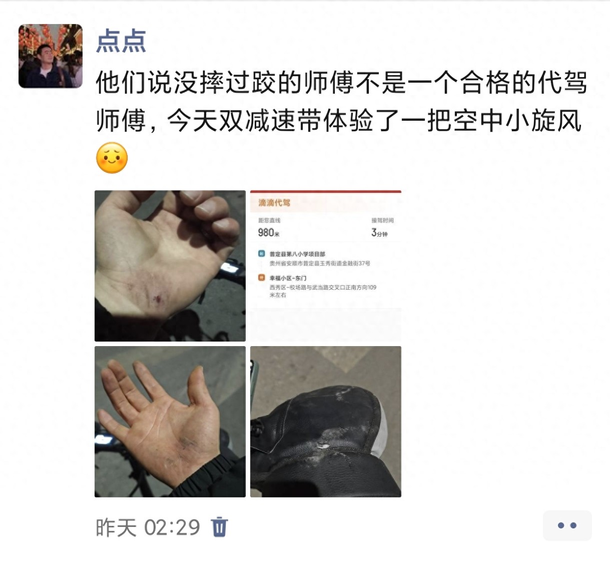 昨天我终于摔跤了,给朋友发了三张受伤的照片,朋友调侃道,你终于是个合格的代驾师傅了,我不知道回复什么,只能暗自苦笑。
