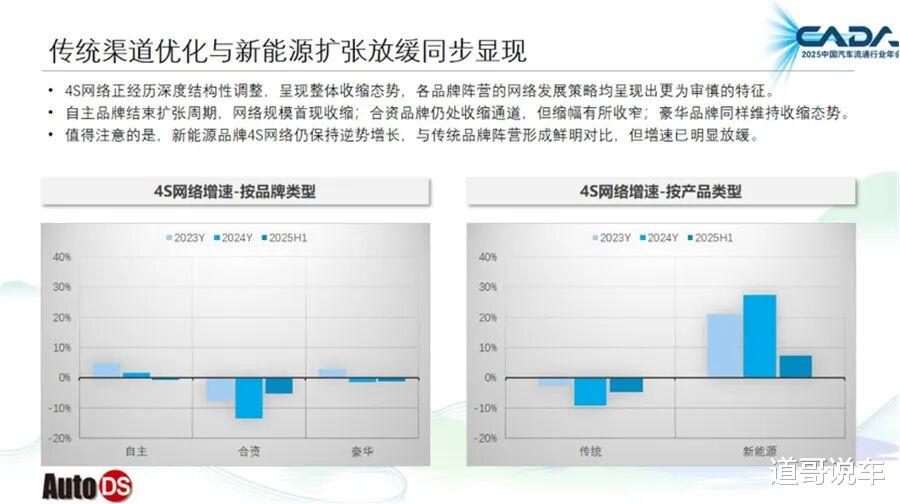 根据中国汽车流通协会的数据,自主品牌网络扩张增速从2023年到2025年上半年逐年降低,2025年上半年已经呈现负增长。而合资品牌的网络收缩幅度则在今年上半年大幅度降低,甚至比2023年时更低。