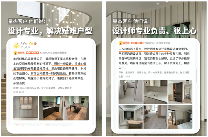 星杰设计师除了具备设计专业能力、全案落地能力外,还具备服务能力,全程服务客户,让客户省心。星杰以设计师为中心,从设计到施工1人负责到底,业主有任何疑问都可直接找到专属设计师解答,无需与施工工人、材料供应商等多方沟通,大幅减少沟通成本。