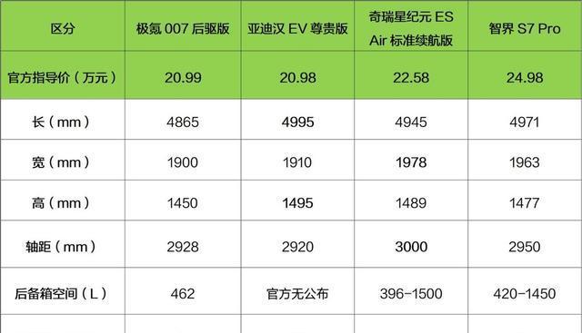 为了清晰且直观地展示极氪007后驱版车型在空间上的优势,凡哥特地挑选了与极氪007价位相近的比亚迪汉EV、奇瑞星纪元ES以及智界S7的尺寸参数来进行对比分析,具体的数据对比已在下图中详细列出。