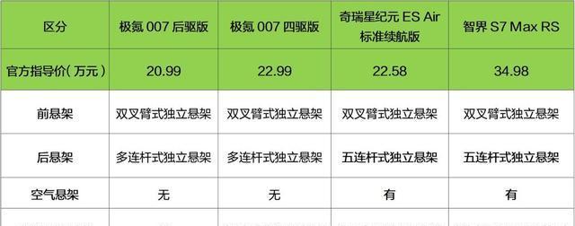 在底盘悬架的配置上,极氪007、奇瑞星纪元ES以及智界S7的所有车型均采用了前双叉臂式独立悬架与后多连杆式独立悬架的组合。特别值得一提的是,智界S7系列中的旗舰车型,即售价为34.98万元的顶配版本,更进一步搭载了空气悬架系统,该系统能够实现悬架的软硬及高低调节功能,并且增配了CDC可变阻尼减振技术,以提升行车舒适度与操控性能。另一方面,奇瑞星纪元ES全系均标配了空气悬架,同样支持悬架的软硬与高低调节,并且集成了先进的CDC电磁减振系统,以带来更加精细化的路面适应能力。相比之下,极氪007的全系车型则未配备空气悬架,但其四驱版本车型特别装备了CCD电磁减振系统,以确保出色的操控稳定性与路面适应性。