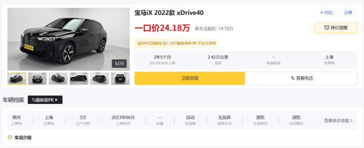 不过,随着市场竞争的加剧,宝马iX采取了“高开低走”的策略,2025年部分地区经销商报价已经低于52.19万元(xDrive40),相较于74.69万元的指导价来说,优惠超过22万元。然这还不算更夸张的,从懂车帝二手车平台了解到,如今行驶里程在3万公里左右的2022款宝马iX挂牌价24.18万元,残值率仅剩32.3%,而这台车上牌时间不过2年5个月,这意味着新车仅用2年半的时间,就损失了50万的产品价值。