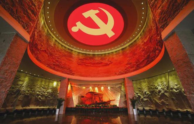 走进南湖革命纪念馆大厅,一眼便看到复刻的红船模型静静陈列、庄严肃穆。抬眼仰望,一枚巨型党徽高悬穹顶,熠熠生辉,令人肃然起敬。