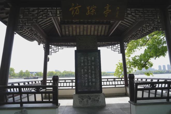 1964年4月5日,董必武专程到南湖视察,在一大纪念船上,董必武回顾了当年“一大”开会的情景,心情激动,挥笔题写七绝诗一首“革命声传画舫中,诞生共党庆工农。重来正值清明节,烟雨迷濛访旧踪。”短短二十八个字,重现了中国共产党第一次全国代表大会召开的场景,揭开了中国共产党引领一个民族书写救亡图存的壮丽史诗。1985年6月,南湖革命纪念馆将董必武同志题南湖诗镌刻成碑,并建亭于纪念船东面临水处,立碑于亭中。1986年,中共中央军委常务副主席杨尚昆来南湖,为亭题额“访踪亭”。访踪亭静静临湖而立,无声诉说着红船缘起的百年故事,也承载着后人追寻先辈足迹、传承初心使命的深厚情怀。