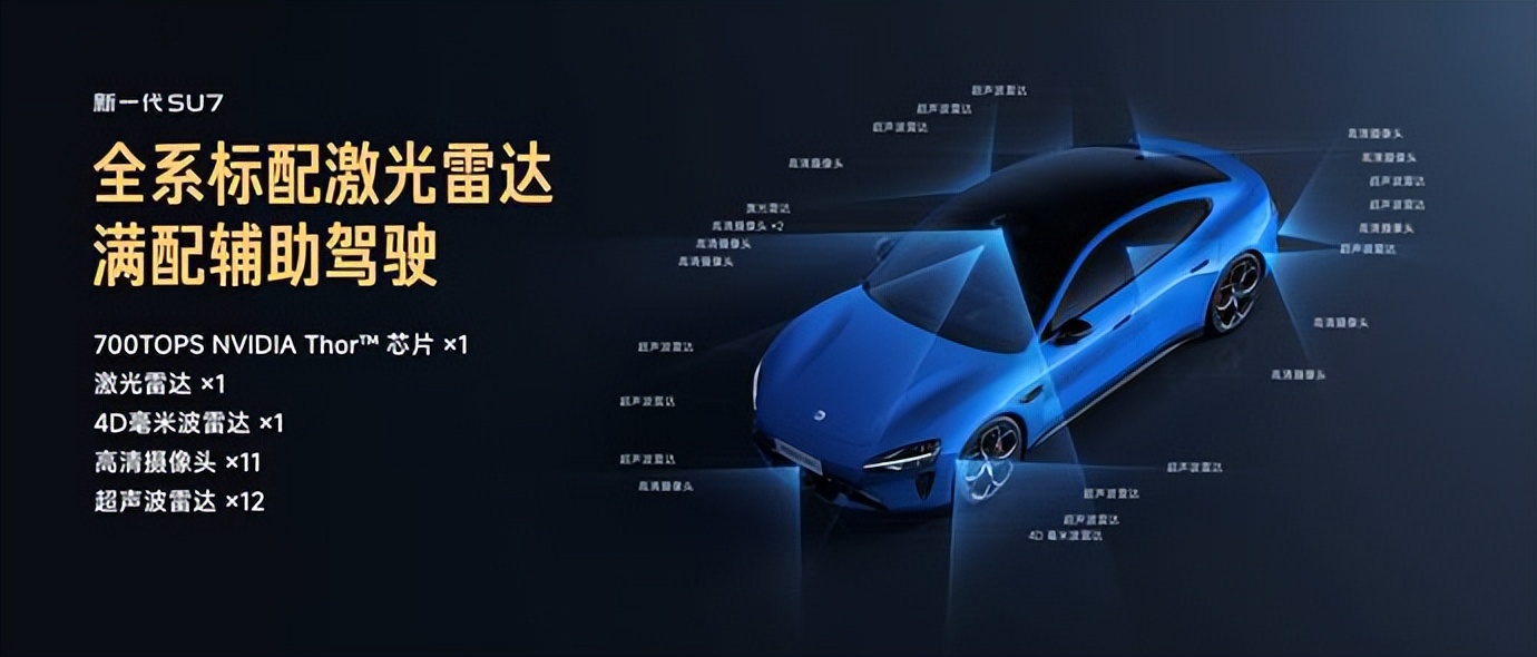 新一代SU7全系标配NVIDIA DRIVE AGX Thor™车载计算平台,算力高达700TOPS,较前代提升37.8%,采用与NVIDIA旗舰芯片同源的Blackwell架构,具备更强的并行计算与深度学习能力,支持更高速数据传输与多样化连接,配合高性能DDR缓存,显著提升系统响应速度与决策效率。在感知硬件方面,全系标配1个激光雷达、1个4D毫米波雷达、11个高清摄像头、12个超声波雷达。