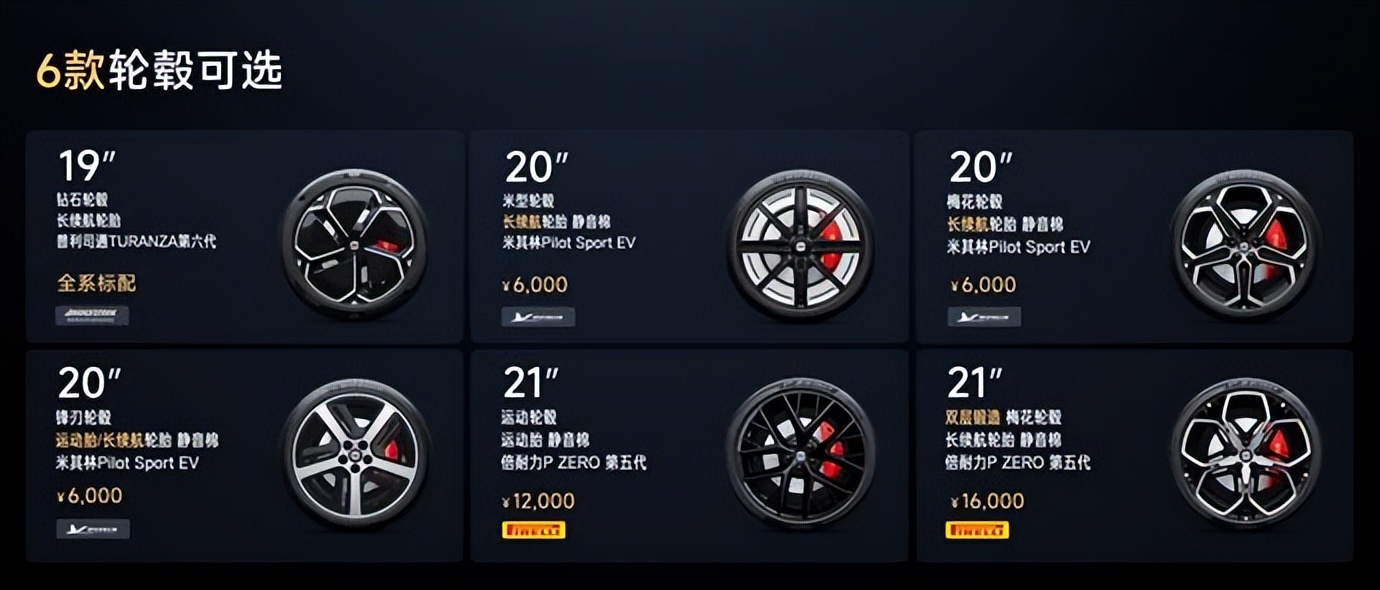 新一代SU7全系提供6款轮毂选择,其中包含3款新轮毂,满足多样化审美需求。全新轮毂为19英寸钻石轮毂、20英寸锋刃轮毂和21英寸双层锻造梅花轮毂。其中21英寸的双层锻造梅花轮毂采用双层结构设计,经13小时铣削成型,使用22把专用单晶金刚石刀具,持续铣削6小时,精准勾勒龙鳞纹路,实现亮面连续、纹理清晰的高阶工艺表现。除此之外,还有经典的20英寸梅花轮毂、20英寸米型轮毂和21英寸运动轮毂可以选择。