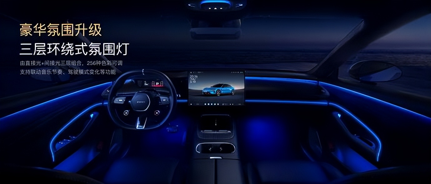 除此之外,内饰细节设计也迎来更多优化,中控台改为对称式布局,优化主副驾操作便利性;高频接触面实现100%软质材料包裹;方向盘采用Nappa真皮包裹,配合镀铬装饰件,强化高级感;珠宝质感的高亮电铸按键,提升操作触感与视觉精致度;门板与座椅引入豪车级绗缝工艺,搭配金属铭牌与扬声器金属网罩,实现细节层面的精致表达;环抱式氛围灯实现同级最长,长度达3636mm,从中控台延伸至后排。氛围灯采用三层环绕结构,由直接光与间接光组合构成:直接光用于勾勒座舱轮廓,间接光营造沉浸式氛围。支持上下拼色设置,可联动音乐节奏与驾驶模式变化,并具备开门预警功能,兼具情绪价值与实用功能。灯光律动与门板放射状绗缝设计形成视觉呼应,显著提升座舱豪华感与精致感。