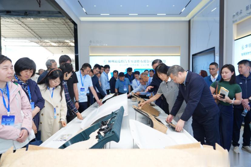 在柳东工厂基地,代表们观摩了竹纤维复合材料轻量化设计与成型技术及其自动化生产示范线。通过自主研发的竹纤维气流—机械均匀铺装技术,实现竹纤维复合材单元的连续化制备与自动化铺装,确保最终产品密度高度均匀,大幅提升生 产效率与质量一致性,为大规模、低成本应用于汽车工业铺平道路。同时,五菱还突破竹纤维与树脂界面结合的关键技术,采用“竹纤维—低熔聚合物”界面增韧技术,显著提升界面剪切强度,在竹纤维与树脂间建立 起稳固的应力传递 “桥梁”,避免开裂、分层等问题,确保复合材料 在车辆震动、温差变化等复杂工况下的长期可靠性。