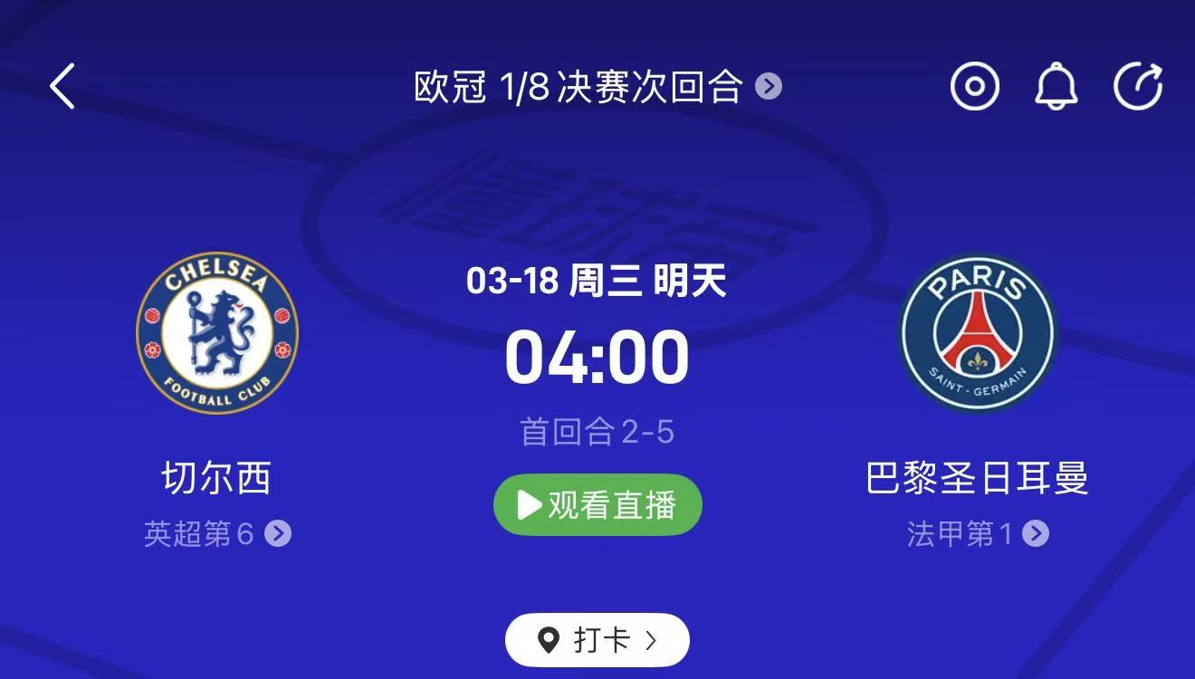 🔹 周二007 欧冠:切尔西 vs 巴黎圣日耳曼(04:00)