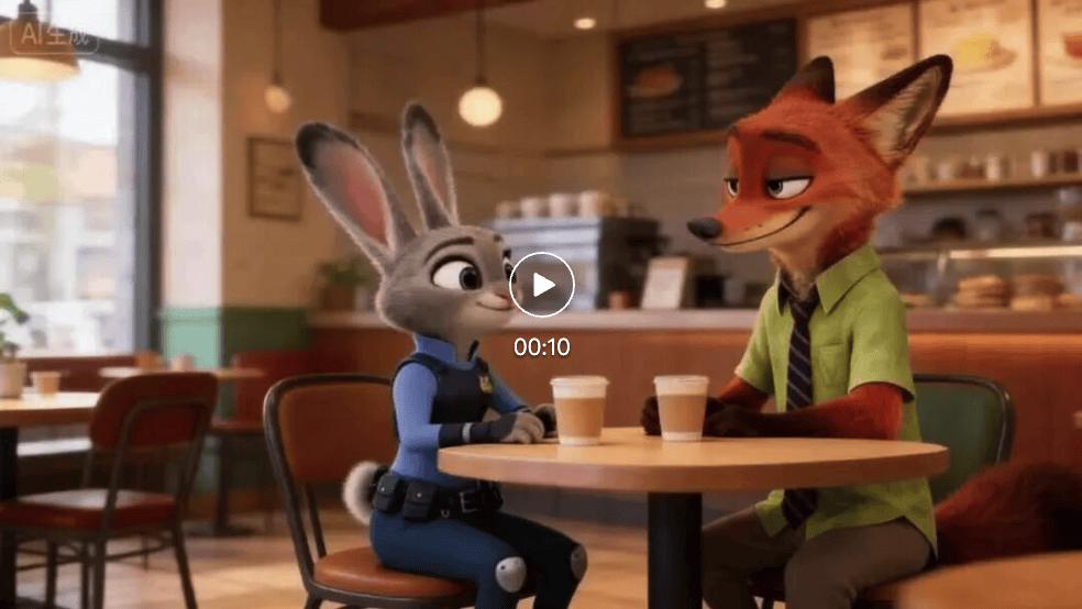 此外,它还支持多人物互动场景。我们上传了朱迪和尼克在咖啡店喝咖啡的参考图,为每个对话片段配置音频。