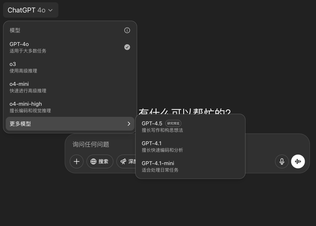 一般来说,GPT-4o 是可以解决大部分日常任务的,所以我们日常对话一般默认用这个模型。除非是特别需要推理能力的对话,我们会切换到 o 系列。
