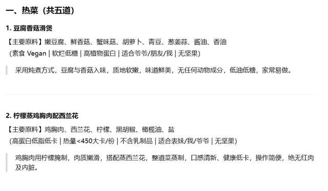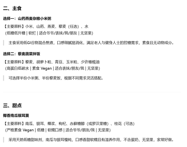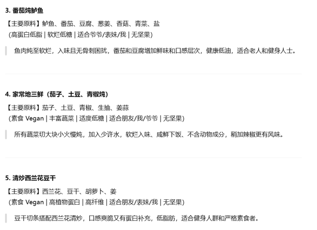 5 个热菜,需含:至少 1 款严格素食主菜,1 款高蛋白低脂低碳主菜(<450 大卡 / 份),1 款适合爷爷和我的主菜主食至少 1 款,须兼顾低糖和低碳水(可多选)甜点 1 款,须严格素食低糖每道菜名后标注其主要特点 / 适合人群(如:素食 Vegan、高蛋白低卡、软烂低糖、无坚果)菜品风味丰富,避免单一,创意但易做,不用复杂厨具和特殊食材下图是结果,令人很惊讶的是,GPT 4.1 居然都记住了。