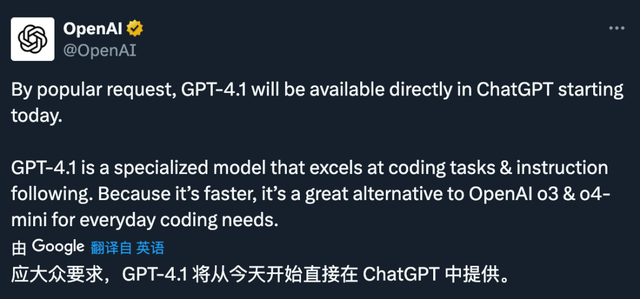 似乎有「一些用户」向 OpenAI 有关部门反馈了什么,所以 OpenAI 说:自 4 月份在 API 中推出以来,GPT-4.1 就成为了开发人员的最爱。应群众的要求,我们直接在 ChatGPT 上线 GPT-4.1 了。